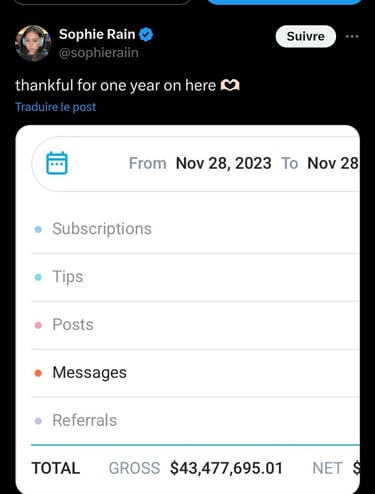 Dans une révélation étonnante, Sophie Rain a dévoilé sur Twitter qu'elle gagnait près de 4 millions de dollars par mois, portant son revenu annuel à un total stupéfiant de 43,5 millions de dollars. Ces chiffres, qui dépassent même les salaires de certains footballeurs de renom, témoignent de l'énorme potentiel financier que représente certaines carrières d'influenceuses sur les réseaux sociaux. La jeune star américaine illustre parfaitement comment les plateformes numériques peuvent transformer la vie de certaines personnes audacieuses.